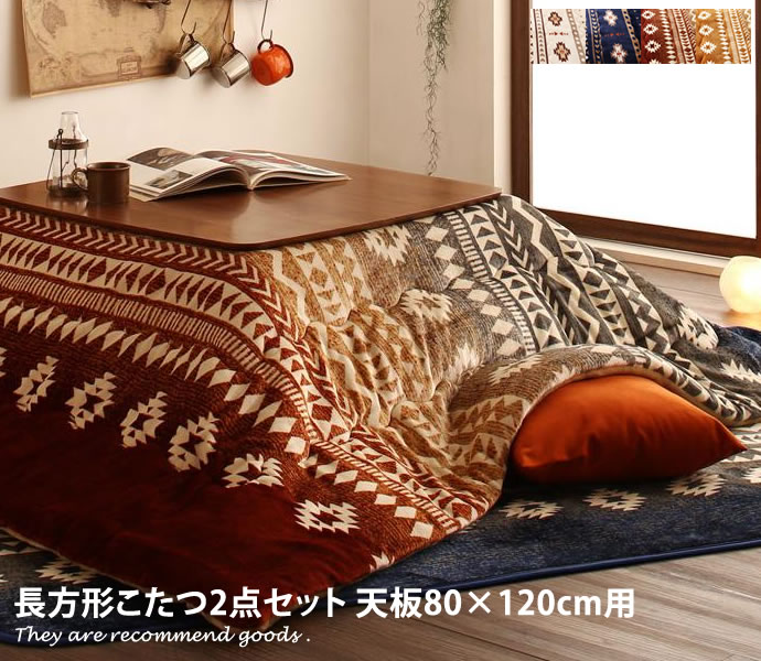 【天板80cm×120cm用】こたつ布団2点セット エスニック調 キリム柄 掛け布団 敷布団 はっ水加工 防臭 フランネル アイボリー 抗菌 ネイビー レッド イエロー 丸洗いOK スタイリッシュ おしゃれ家具 おしゃれ 北欧 モダン