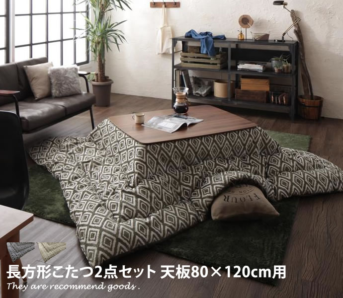 【天板80cm×120cm用】こたつ布団2点セット 幾何柄 掛け布団 敷布団 ヴィンテージ風 ネイビー コンパクト ジャガード織り カーキ スリム マイクロファイバー オールシーズン ホットカーペット対応 おしゃれ家具 おしゃれ 北欧 モダン